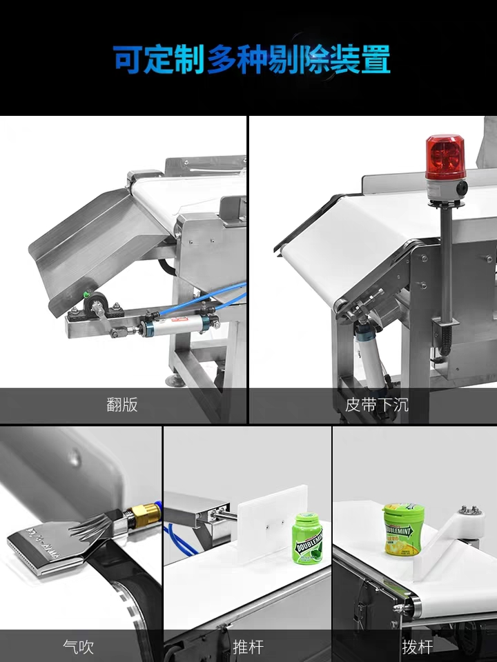 7、剔除装置:配备挡臂式、吹气式、翻板式、升降皮带式等剔除装置