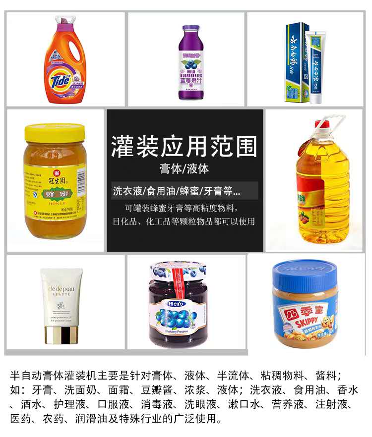 5、膏体灌装机针对医药(妇科用药,皮炎平,红霉素软膏,防冻霜等)、日化(牙膏,鞋油,润肤霜,化妆品等)、食品(芝麻酱,甜面酱,番茄酱,奶油等)、化工(玻璃胶、密封胶、白乳胶等)、润滑油及特殊行业的膏体灌装